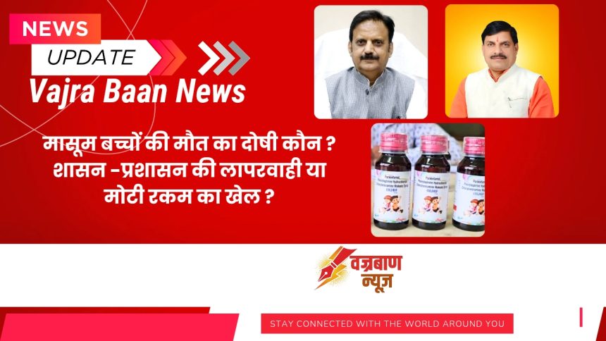 वज्र बाण (नवनीत दुबे) बीते दिनों कफ सिरप के सेवन से हुई मासूम बच्चों की मौत ने प्रदेश से केंद्र तक हाहाकार मचा दिया,विपक्ष मध्यप्रदेश की सत्ता धारी भाजपा की मोहन यादव सरकार को घेरने सड़को पर उतर आया है,तो वही सत्ता के हुक्मरान व मुख्यमंत्री मोहन यादव मृत बच्चों के प्रति संवेदना प्रकट करते नही थक रहे,मद्दे की बात…